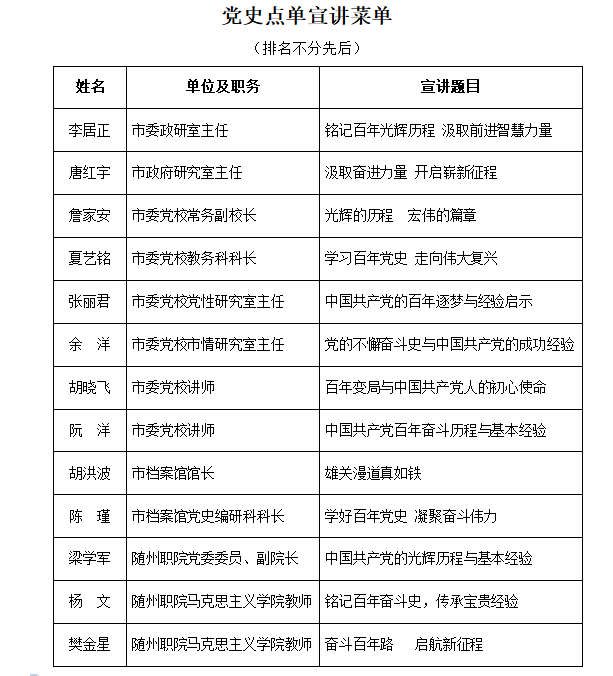 為慶祝中國(guó)共產(chǎn)黨成立100周年,深入學(xué)習(xí)貫徹習(xí)近平新時(shí)代中國(guó)特色社會(huì)主義思想,推動(dòng)黨史學(xué)習(xí)教育扎實(shí)開展,市黨史學(xué)習(xí)教育辦公室組織黨史學(xué)習(xí)教育市委宣講團(tuán)專家精心備課,形成了一批黨史專題宣講精品課程,從即日起面向市直部門、國(guó)有企業(yè)、高等院校及基層單位提供點(diǎn)單宣講服務(wù)。 各地各單位如有宣講需要,可向市黨史學(xué)習(xí)教育辦公室宣講工作組提出書面申請(qǐng),宣講工作組協(xié)調(diào)推薦宣講專家,聯(lián)系人:熊小瓊,聯(lián)系電話:0722-3593137。宣講情況報(bào)市黨史學(xué)習(xí)教育辦公室宣講工作組備案。 |