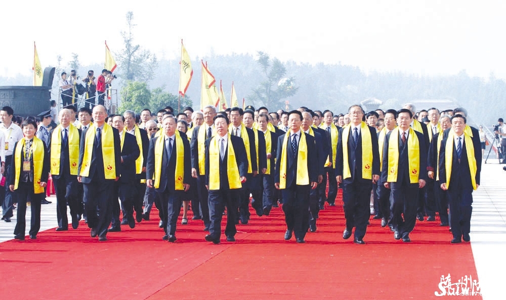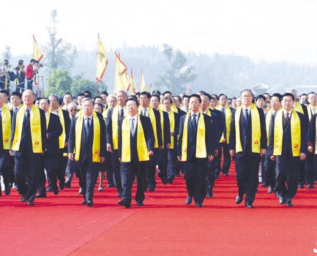 ▲參加尋根節(jié)的領(lǐng)導(dǎo)和嘉賓步入大典現(xiàn)場(chǎng)。前排為:全國(guó)人大常委會(huì)副委員長(zhǎng)陳昌智(前排右四)、全國(guó)政協(xié)副主席孫家正(前排左四)、湖北省委書(shū)記、省人大常委會(huì)主任李鴻忠(前排右三)、全國(guó)人大環(huán)境與資源保護(hù)委員會(huì)副主任委員羅清泉(前排左三)、湖北省人民政府省長(zhǎng)王國(guó)生(前排右二)、海峽兩岸關(guān)系協(xié)會(huì)副會(huì)長(zhǎng)李炳才(前排右一)、國(guó)務(wù)院僑辦副主任趙陽(yáng)(前排左二),全國(guó)文聯(lián)副主席、黨組成員楊承志(前排左一)。 |