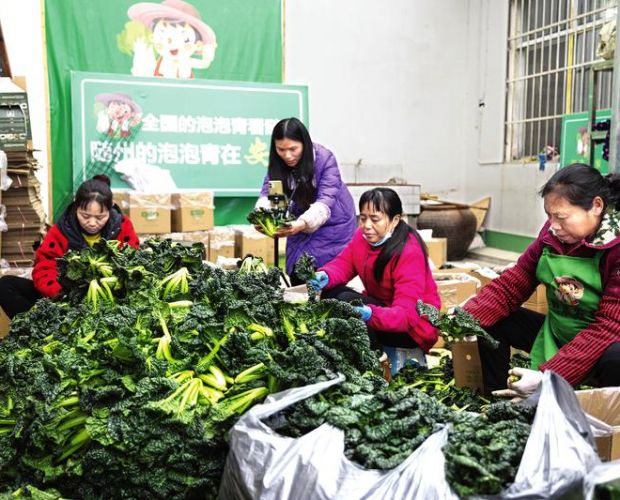 隨縣安居鎮(zhèn)“鮮選農(nóng)家食品”通過現(xiàn)場(chǎng)直播帶貨等方式,將隨州泡泡青推銷到全國各地,每天接到的網(wǎng)上訂單少則數(shù)百份,多則近千份。圖為“鮮選農(nóng)家食品”一邊組織工人包裝泡泡青,一邊請(qǐng)網(wǎng)紅現(xiàn)場(chǎng)直播。