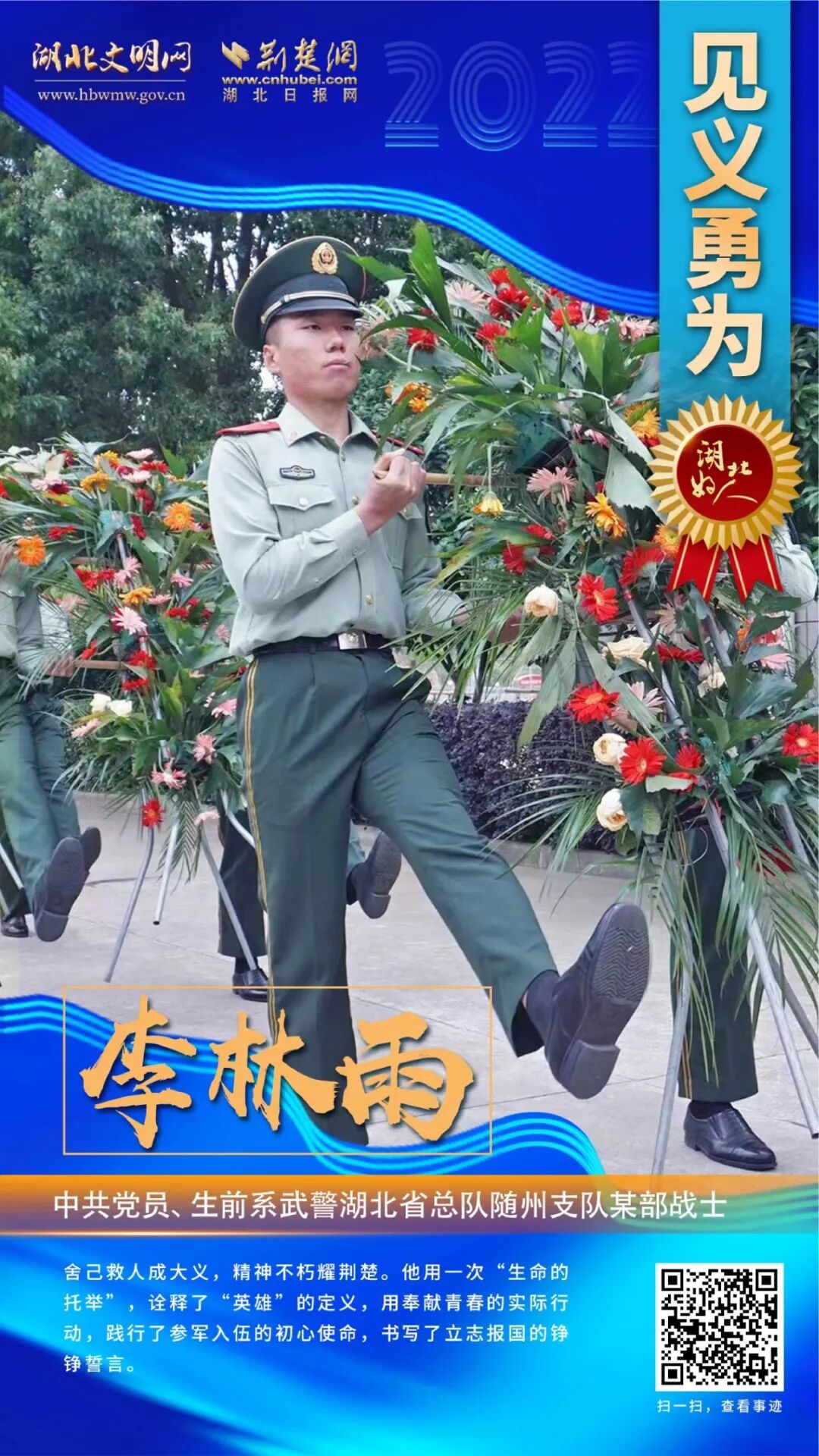 李林雨,男,漢族,山東新泰人,2000年5月出生,2021年12月入伍,生前系武警湖北省總隊隨州支隊某部戰(zhàn)士。2022年7月12日,李林雨在與戰(zhàn)友執(zhí)行巡邏任務途中,成功營救了一名57歲的落水群眾,自己卻因體力透支英勇犧牲,年僅22歲。2022年8月,經武警湖北省總隊黨委研究,報請武警部隊政治工作部核準,批準李林雨為烈士,追授平時一等功,追認李林雨為中國共產黨黨員。