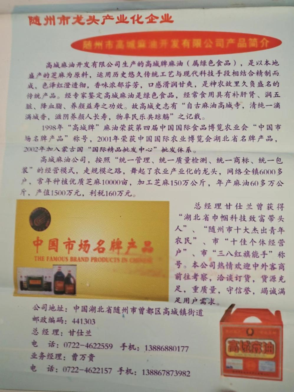 隨縣高城鎮(zhèn)精制麻油以地產優(yōu)質芝麻為原料,采用手工作坊式傳統(tǒng)工藝精制而成,出油澄清,無任何添加劑,口感純正。生產的各種散裝、瓶裝、聽裝芝麻油,工序考究,制作精良,具有色純、味濃、清香、質優(yōu)等特點,是食用佳品,也是饋贈精品。