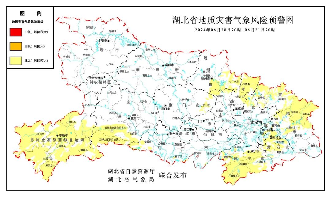 2024年6月20日20時—6月21日20時,預計恩施地區(qū)、鄂州市、咸寧地區(qū)、黃石地區(qū)、宜昌(長陽、五峰、宜都)、荊州(松滋、石首局部、監(jiān)利東南局部)、荊門(京山)、隨州(曾都區(qū)、廣水)、孝感(大悟、安陸、孝昌)、武漢(黃陂北部和中部、新洲東北部)、黃岡(黃州區(qū)、紅安、麻城、團風、羅田、英山、浠水、蘄春),以及其他強降水區(qū)域發(fā)生崩塌、滑坡、泥石流的風險較大,請相關地方政府及有關部門按照《湖北省地質(zhì)災害防范規(guī)程》和預警響應工作方案做好地質(zhì)災害防范工作。請以上地區(qū)自然資源部門及時逐級向上級自然資源部門反饋相關情況。