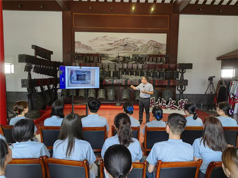 在曾侯乙墓編鐘展示廳,湖北省文物考古研究院副院長、研究員郭長江主講,圍繞曾國700年,通過擂鼓墩、葉家山、棗樹林等墓地出土文物考古發現史證,系統解讀了神密國度古曾國的發展史。通過直播宣傳,更好地弘揚曾隨文化,增強文化自信。(通訊員任尚海、程娜娜攝)