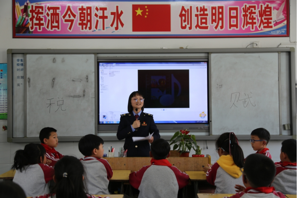 法啟童智。在操場上,稅務干部和孩子們通過互拉家常、互問互答,分享與生活、學習密切相關的案例小故事,講解網絡詐騙、校園霸凌、高空拋物等法律知識,引導孩子們增強法律意識,養成守法自覺。
