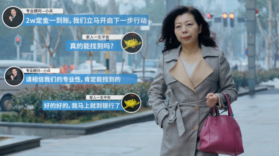 劇中,騙子冒充尋人機構客服,謊稱知道失蹤人員下落,主動聯系楊大姐,以先付錢后告知其兒子詳細情況的手段實施詐騙……
