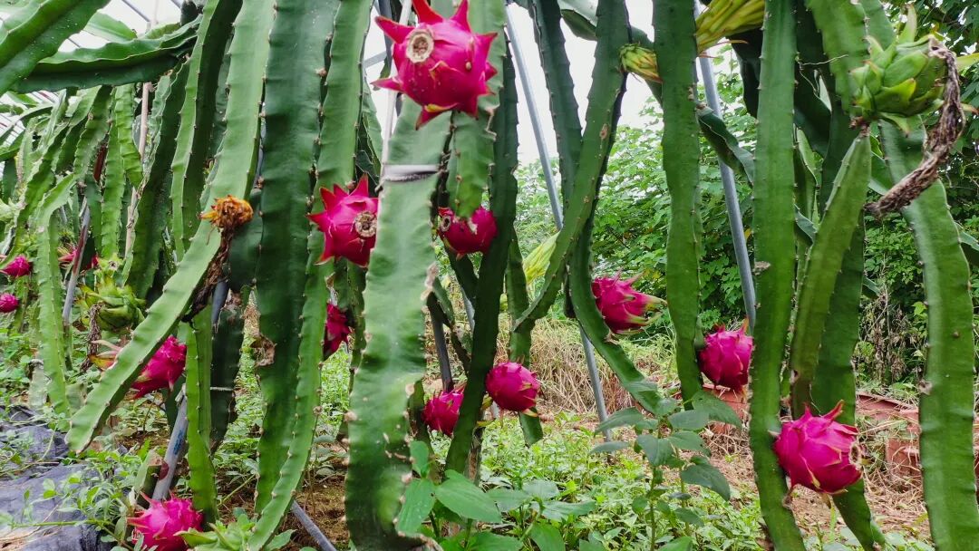 黃凱說:“我們果園的火龍果采摘期較長,從每年的7月份持續(xù)到10月份。目前來看,今年火龍果的產(chǎn)量要比去年高,一畝地能達到兩千多斤,每畝效益在3萬元左右?!?/p>