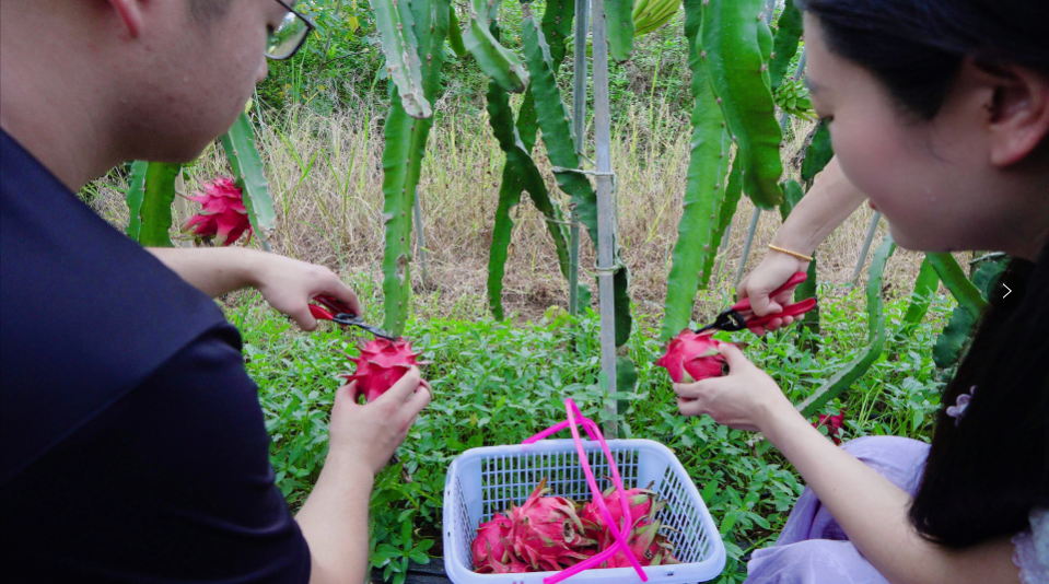 果園里,游客們?nèi)宄扇?,興致盎然地采摘火龍果,他們一手托著火龍果,一手握著剪刀,小心翼翼地采摘下一顆顆色澤鮮艷、果形飽滿的火龍果。不一會兒,便收獲了滿滿一籃。