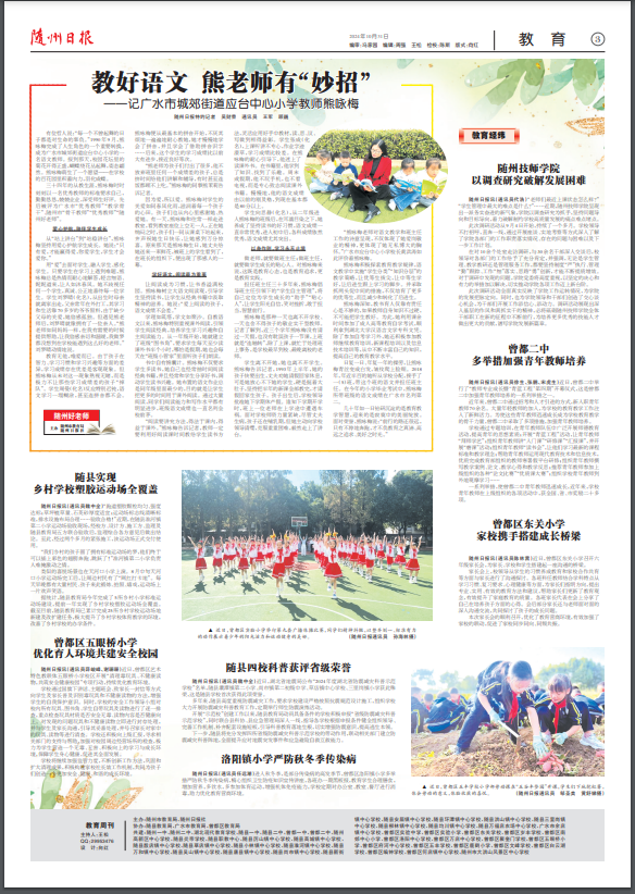 三十四年的從教生涯,熊詠梅時時刻刻以一名優(yōu)秀教師的標準要求自己,勤勤懇懇,兢兢業(yè)業(yè),深受師生好評。先后被評為廣水市“優(yōu)秀教師”“教學骨干”、隨州市“骨干教師”“優(yōu)秀教師”“隨州好老師”。