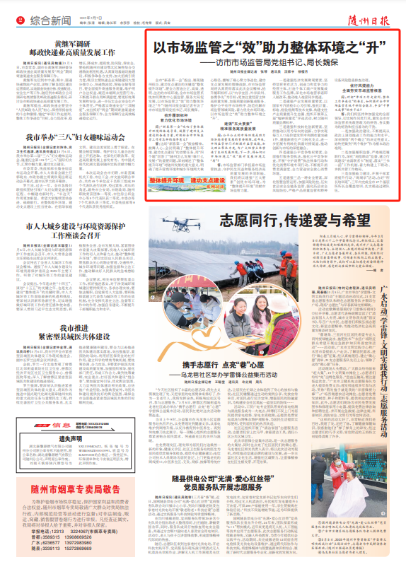全市“新春第一會”指出,展現隨州擔當、建功支點建設的關鍵是“整體提升環境”,要全力營造公正、高效、透明、法治的市場環境。全市市場監管系統如何聚焦中心強監管、服務大局促發展,以市場監管之“效”助力整體環境之“升”?隨州市融媒體中心記者專訪了市市場監管局黨組書記、局長魏保。