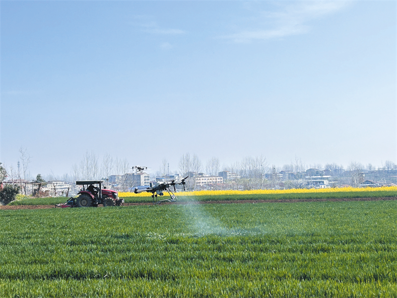 隨縣萬福店農(nóng)場鳳凰山村“一噴三防”現(xiàn)場。(隨州日報全媒記者滕銳攝)