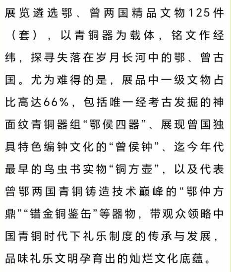 展覽以隨州地區歷年發掘的曾國墓葬出土的豐富青銅器為依托,逐次呈現曾國自西周早期至戰國中期約700年間的歷史變遷,引導觀眾認識曾國在不同歷史階段所體現出的變化融合的時代特征。