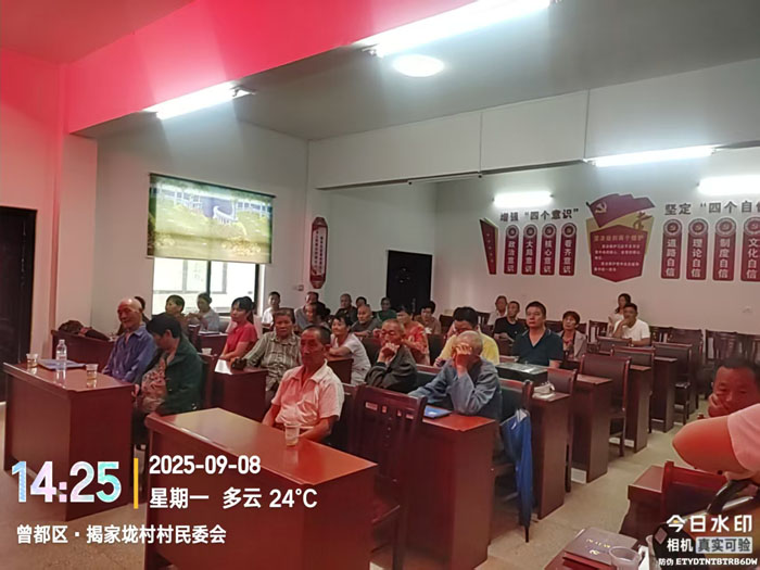 隨州新聞網訊 (通訊員戴道新、李金柱)9月8日下午,曾都區洛陽鎮揭家垅村大會議室里,講臺背面懸掛“回顧、傳承、展望:基本公共衛生服務,我服務你健康”“培養健康生活方式,筑牢家庭健康基石”兩大主題宣傳橫幅,該鎮衛生院健康管理團隊家庭醫生簽約小組成員之一,公衛醫生在村干部的主持下正在開展主題宣講。醫共體單位曾都區人民醫院下派揭家垅村全科醫生、洛陽鎮衛生院派駐揭家垅村第一健康管理團隊家庭醫生簽約小組全體成員、揭家垅村全體干部及簽約村民、慢性病對象、低收入人口等重點人群共計60余人一同參加。