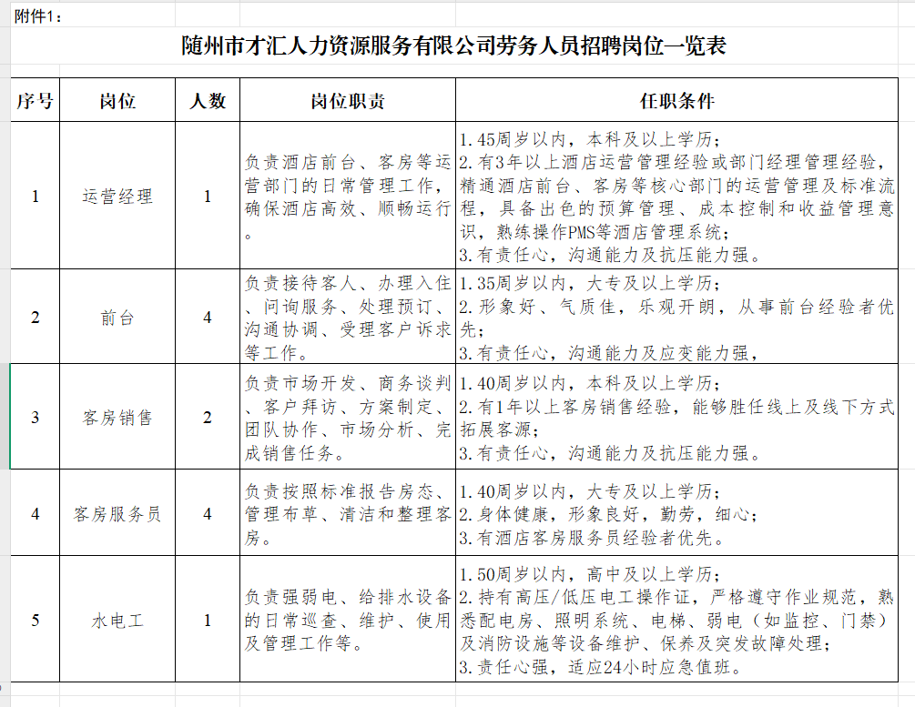 因工作需要,隨州市才匯人力資源服務(wù)有限公司(以下簡稱“才匯公司”)面向社會招聘勞務(wù)外包人員,派遣至某酒店工作,F(xiàn)公告如下: