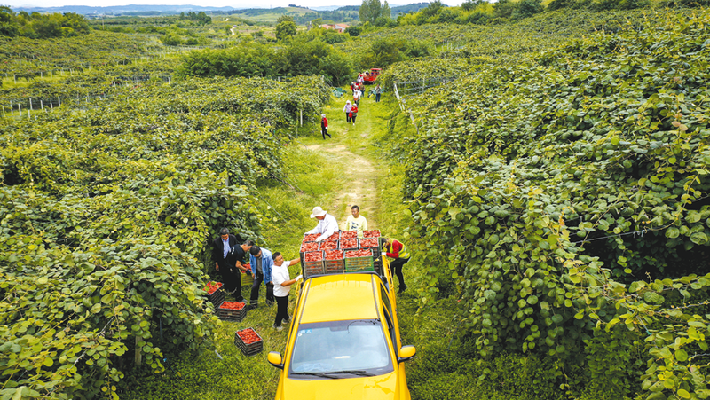 桃李飄香獼猴桃種植基地位于十蔡線公路兩側,由蔡河鎮2017年引進浙江客商,流轉十蔡線沿線院子灣、白水河、石堰塘、木搭橋、老虎崗5個村4000畝土地建設,栽種獼猴桃樹10萬余株。除少量8月完成采摘的紅心獼猴桃,大面積的黃心獼猴桃于9月中下旬迎來豐收季。9月18日,基地黃心獼猴桃采摘首日。一大早,天剛亮時,兩輛中巴車滿載著務工村民到達果園——除部分住果園周邊的務工村民自行前往,從郝店、余店等周邊鎮及蔡河鎮其他村過來的務工村民,由基地安排中巴車統一接送。果園搶時采收用工量大,基地管理人員提前數月便與周邊鎮村聯系,各村幫忙統計對接,確?;赜霉び斜WC、村民有錢可掙。輕捏試一下軟硬度,摘下果子后扯去一頭的蒂,放進隨身背的粗布包,包中裝滿后再輕倒進一旁的塑料水果筐內……一片片獼猴桃園內,160多名村民分散開來,捏、扯、放、倒,雙手翻飛忙采摘。力氣更大的男工則負責將裝滿筐的獼猴桃搬到路邊,裝上皮卡,轉運至中轉集散處。“從早上到現在,就這筐子,已經裝了好幾十筐了?!鄙衔?1時,在果園采摘的村民秦正英說?!鞍影停形绻芤活D飯,這天不冷不熱,一天工錢八九十塊,我們這么大年紀了,還可以!”來自余店鎮的村民張仁英說出大伙兒的心聲。一筐筐裝得滿滿當當的獼猴桃,一車車往外運。冷庫前是中轉集散處,稱重、裝箱、上貨,也是一派繁忙。基地管理負責人安延江,在冷庫和果園來回跑,調度、指揮。與大伙一樣忙碌的,還有從西安過來的收購商岳鵬勃。“廣水的黃心獼猴桃,酸甜口,品質好。我這次計劃收21萬斤,運到西安去?!痹砾i勃說。9月19日傍晚,21萬斤獼猴桃全部運出。據了解,該基地去年收獲獼猴桃約350萬斤,實現銷售收入4000多萬元,不僅為當地增加土地流轉收入100多萬元,還帶動周邊160多人季節性務工,每年發放村民務工工資500余萬元。“這么多人一起忙,總共大概得半個月才能摘完。”安延江說,采摘下來的果子部分暫存冷庫,部分由收購商直接拖走。因果實品質好,桃李飄香果園的獼猴桃不愁銷,遠銷上海、深圳等地。蔡河鎮雨水豐沛、光熱充足、低山丘陵較多,是遠近聞名的果鄉,近年來大力發展獼猴桃產業。今年4月,農業農村部發布了2025年農業產業融合發展項目立項名單公示公告,廣水市蔡河鎮入選產業強鎮立項建設名單。桃李飄香基地也正規劃著加大投資,擴基地、建果酒果飲深加工線、推研學游,延長產業鏈,助力全鎮獼猴桃產業融合發展。記者 | 李文軍 陳云 特約記者 程淇 通訊員 艾港灣