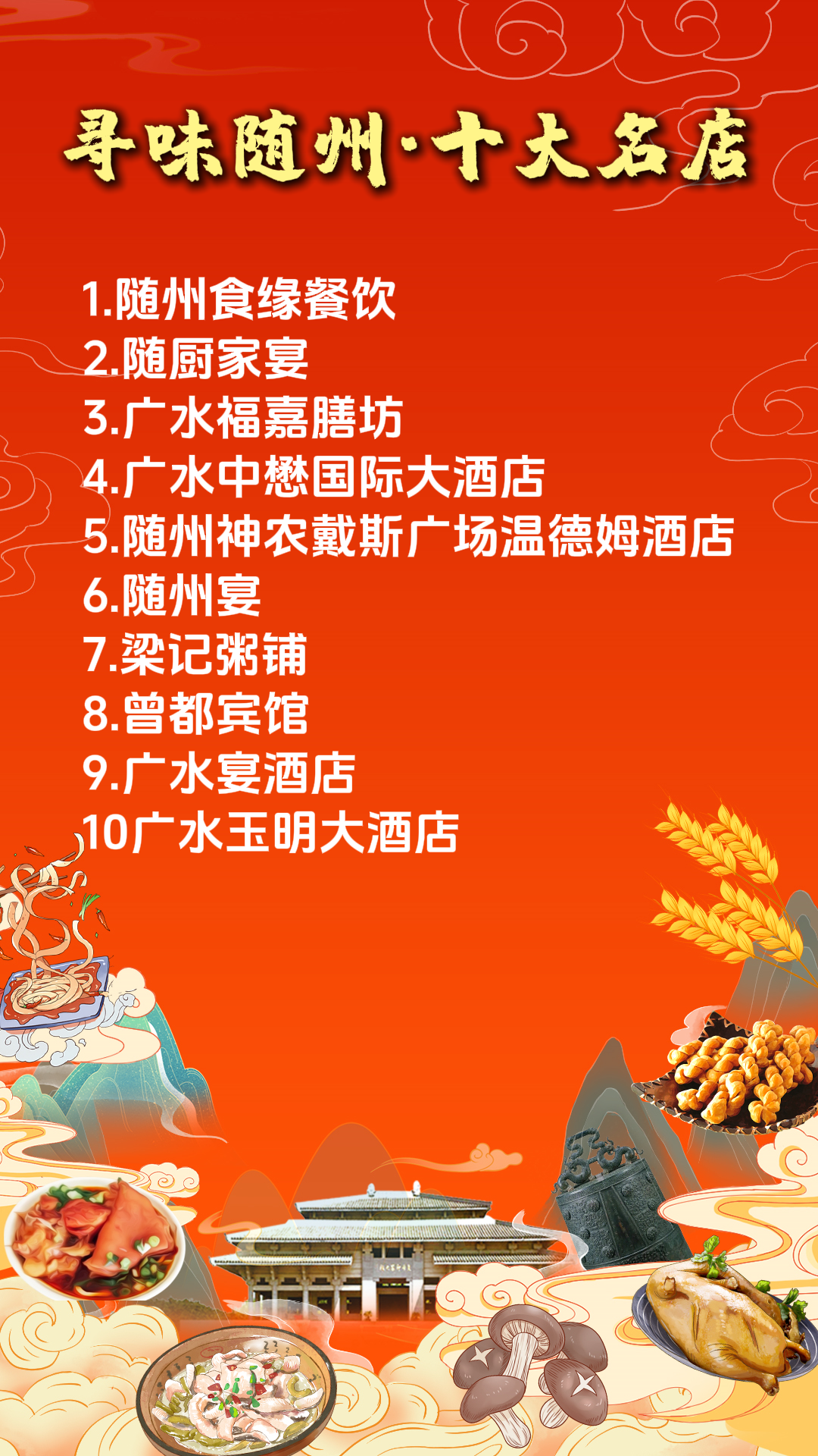 圍繞評選出的十大名店、名菜、名小吃,拍攝系列探店視頻,持續為隨州美食引流賦能;拍攝制作“隨州美食”宣傳片,編印“隨州美食地圖”,線上線下多渠道免費發放,方便市民、游客查詢。長效聯動拓場景,聯動“戀上隨州”小程序,結合金秋隨州“一季三會七賽”各項活動,策劃美食宣傳展示和游客品嘗體驗等活動,持續提升“隨州味道”的知名度和影響力。
