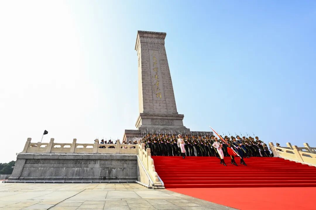 9月3日,紀念中國人民抗日戰爭暨世界反法西斯戰爭勝利80周年大會在北京隆重舉行。這是國旗護衛隊從人民英雄紀念碑基座出發,走向旗桿基座。新華社記者張宏祥 攝