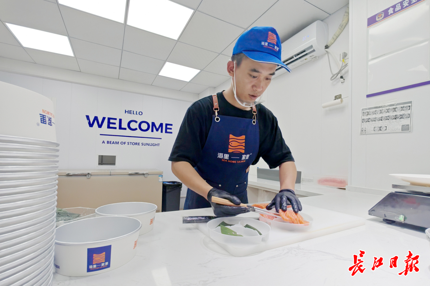 海里家里鄂州店店員在將切好的三文魚裝盤。記者史偉 攝