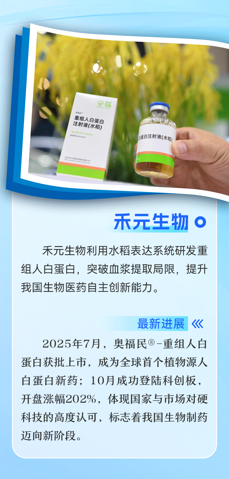 今年7月,武漢禾元生物科技股份有限公司歷經(jīng)20年研發(fā)的奧福民®-重組人白蛋白(水稻)獲批上市,這是全球首個植物表達體系的重組人白蛋白,實現(xiàn)了該領域“從0到1”的重大突破。10月,禾元生物成功登陸科創(chuàng)板,成為“重組人白蛋白第一股”,開盤漲幅202%,彰顯了市場高度認可。