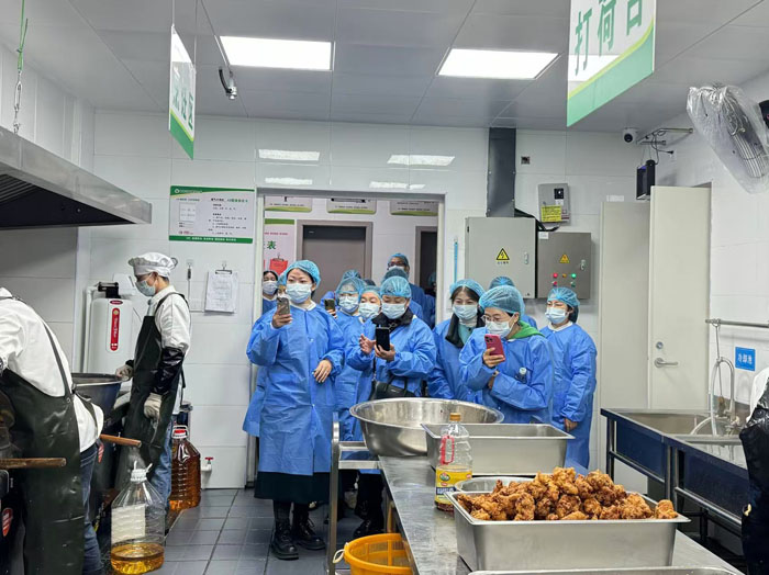 在何玉霞主任的引導(dǎo)下,家長代表們統(tǒng)一換上一次性凈化服,循著"食材倉庫→粗加工間→烹飪間→配餐區(qū)→學(xué)生就餐區(qū)"的專屬路線,沉浸式探訪食堂運(yùn)作全鏈條。大家邊走邊看、邊問邊記,重點(diǎn)核查食材新鮮度、儲存環(huán)境是否達(dá)標(biāo)、消毒設(shè)備是否規(guī)范運(yùn)行等細(xì)節(jié),從源頭到餐桌,每一個環(huán)節(jié)都仔細(xì)把關(guān),讓"舌尖上的校園"真正經(jīng)得起檢驗(yàn)。