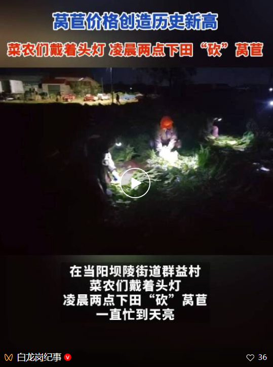 大地還在沉睡。當(dāng)陽(yáng)市壩陵街道群益村卻燈火通明。數(shù)以百計(jì)的人戴著探照燈,砍萵苣、打包、過(guò)磅、裝車(chē)……數(shù)不清的光柱在空中或地面交織。