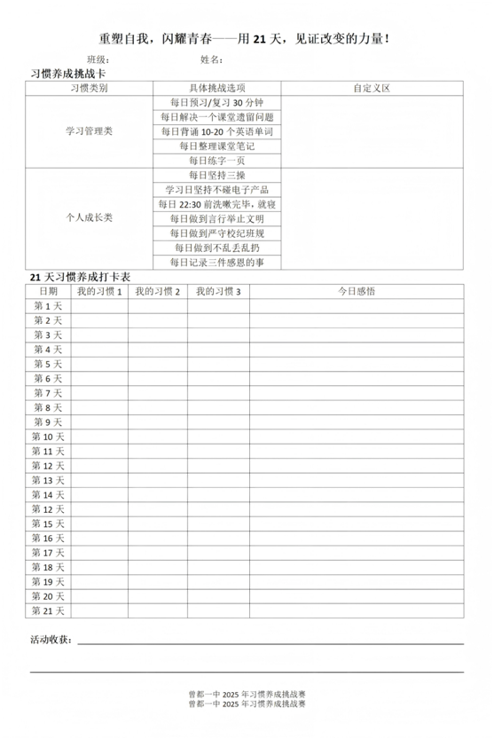 本次挑戰(zhàn)賽以“重塑自我,閃耀青春——用21天,見證改變的力量!”為主題,依托“21天行為固化習(xí)慣”的科學(xué)原理,將活動劃分為啟動期(第1—3天)、堅持期(第4—15天)、鞏固期(第16—21天)三個階段,循序漸進(jìn)引導(dǎo)學(xué)生實現(xiàn)習(xí)慣養(yǎng)成。