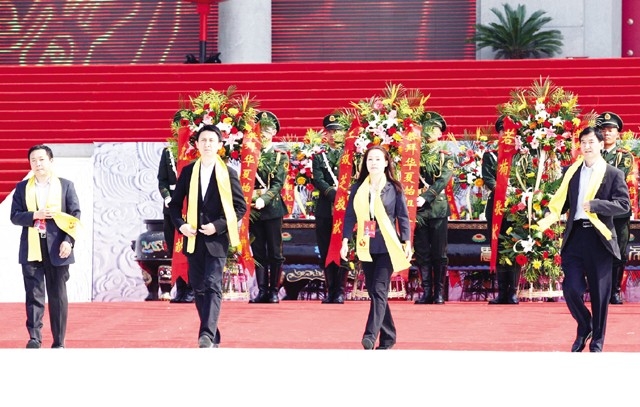 ◆國務(wù)院臺灣事務(wù)辦公室主任助理龍明彪(中)、國務(wù)院僑務(wù)辦公室黨組成員熊昌良(左)、中華炎黃文化研究會常務(wù)副會長屈忠(右)敬獻花籃。