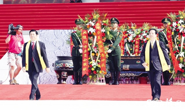 ▲隨州市委書記王祥喜(左)、市長劉曉鳴(右)敬獻花籃。